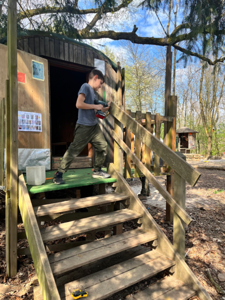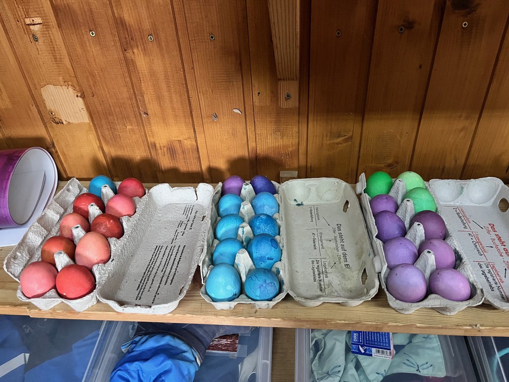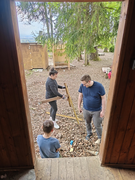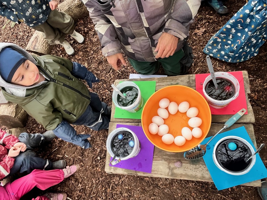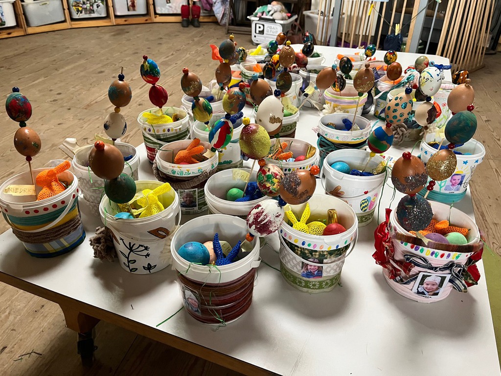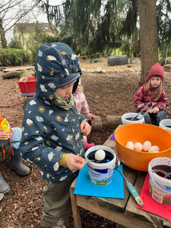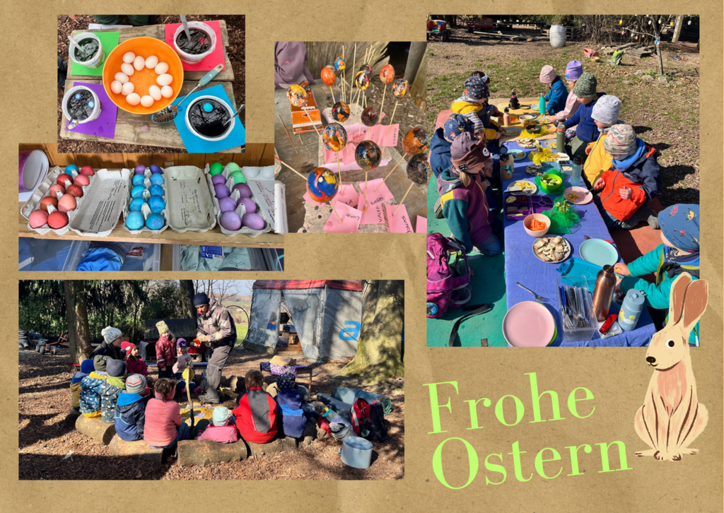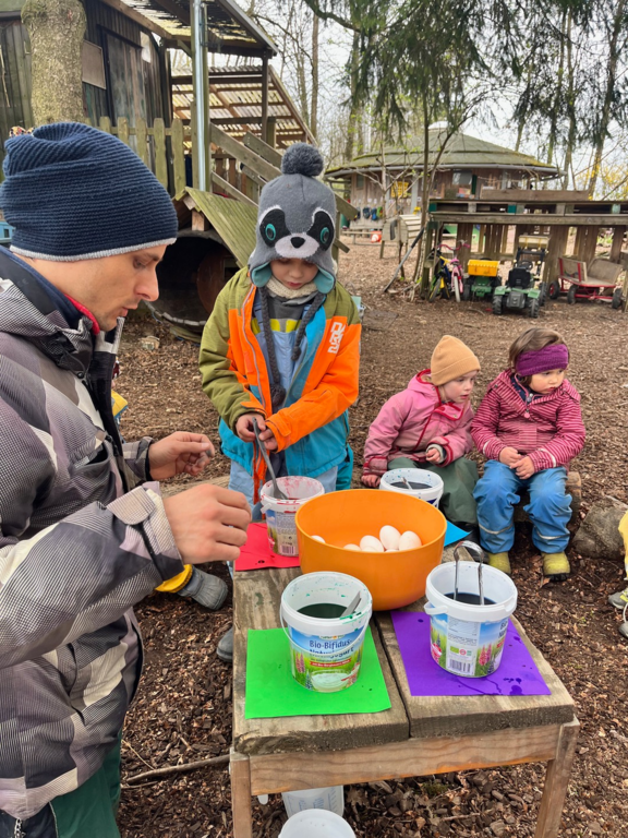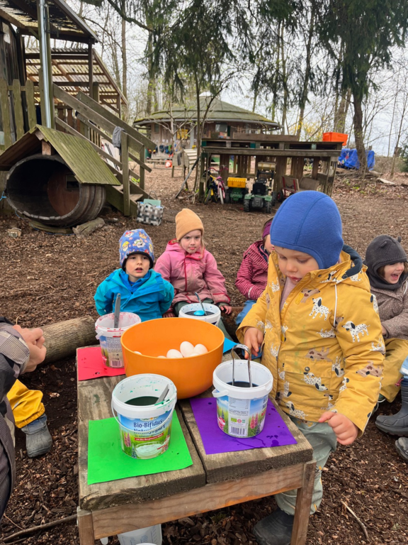 Gemeinsam mit engagierten Eltern wurden beim Arbeitseinsatz der Platz geputzt und renoviert, damit sich alle im Wald wieder rundum wohlfühlen konnten. Es wurde eifrig für Ostern gebastelt und natürlich auch ein fröhliches Osterfest gefeiert.